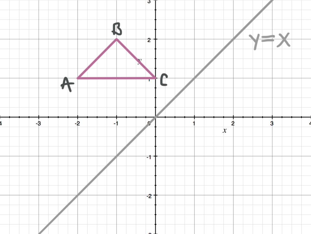Step 1 First we have to write the vertices of the given triangle ABC in matrix form as given below Step 2 Since the triangle ABC is reflected about xaxis, to get the reflected image, we have to multiply the above matrix by the matrix given below Step 3When you reflect a point across a vertical line, only the xcoordinate will be changed The line y = 3 is a horizontal line so we know our reflected point will be (1, y') The original point (1, 2) is just one unit less (or one unit away below it) from the line y = 3, so our reflected point will be one unit away above it, giving us (1, 4)Reflections across the line y = x A reflection across the line y = x switches the x and ycoordinates of all the points in a figure such that (x, y) becomes (y, x) Triangle ABC is reflected across the line y = x to form triangle DEF Triangle ABC has vertices A (